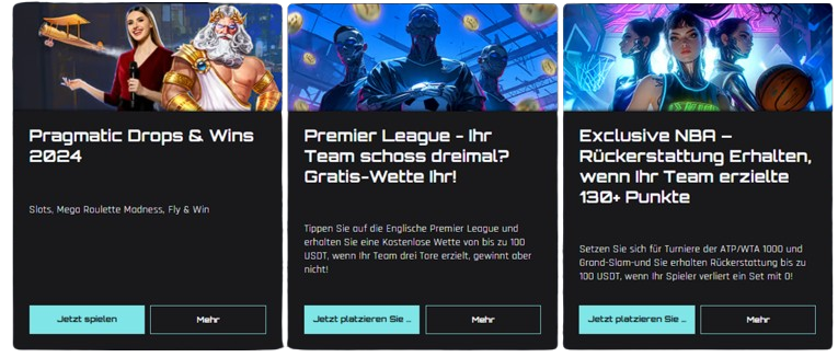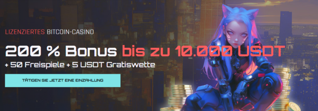 | Willkommensbonus | 200% bis zu 10.000 USDT + 50 Freispiele + 5 USDT Gratiswette |
